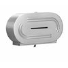 Diplomat Series Toilet Tissue Dispenser. 22 gauge stainless steel cabinet with exposed surfaces in architectural satin finish, designed with unique dual–curve geometry. Welded construction with seamless corners and burr–free edges. 22 gauge stainless steel service door with exposed surfaces in architectural satin finish, designed with unique dual–curve geometry. Hinged at bottom of unit, permits access to storage compartment for servicing of unit. Tumbler lock keyed like other Bradley units. Molded Polyethylene spindle, non–removable by user. Dispenses (2) rolls of up to 5–1/4 inch core toilet tissue. When first roll is used up, fresh roll automatically drops down for use. Unique retaining mechanism prevents use of spare roll until first roll is completely used. Non–controlled delivery. Surface Mounted.
