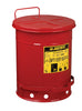 Oily Waste Cans are essential whenever solvent soaked cloths and wiping rags are used. The specially designed lid opens no more than 60 degrees and stay closed when not in use, isolating contents from fire sources and limiting oxygen so spontaneous combustion risk is virtually eliminated. Round construction and elevated bottom encourage circulation of air around can to disperse heat and reduce moisture buildup and rusting. Sleek steel design with compact foot pedal leaves hand free and cover snaps shut when pedal is released. Swinging bail handle in rear makes it easy to carry and empty. FM Approved and UL Listed. 10–year warranty.