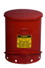 Oily Waste Cans are essential whenever solvent soaked cloths and wiping rags are used. The specially designed lid opens no more than 60 degrees and stay closed when not in use, isolating contents from fire sources and limiting oxygen so spontaneous combustion risk is virtually eliminated. Round construction and elevated bottom encourage circulation of air around can to disperse heat and reduce moisture buildup and rusting. Sleek steel design with compact foot pedal leaves hand free and cover snaps shut when pedal is released. Swinging bail handle in rear makes it easy to carry and empty. FM Approved and UL Listed. 10–year warranty.