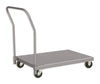 12 gauge steel construction. Sides 2" deep. Floor clearance 5". Equipped with removable handle 36 1/2" L. Maneuvers with 2 swivel, 2 rigid 4" x 2" phenolic casters. Dimensions: 18" x 30". Capacity: 1,000–lbs. Optional flat deck, floor locks, wheel brakes, and extra handles available.