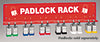 Padlock Shelf Racks. Have stored padlocks readily displayed and available. for use. Open–shelf design shows available padlocks at a quick glance. Ideal for padlocks to be locked in the shelf slots and removed by designated users. Heavy duty shelf is one–piece, angled steel in safety red color. White foil, permanent mark labels (sold separately) to adhere to shelf station to write padlock assignment information. Shelf Stations are available each in Small, which can hold up to 6 padlocks and Standard sizes, which can hold up to 36 padlocks. Padlocks sold separately.