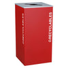 Kaleidoscope Collection XL™ Square 36–gal recycling receptacle. Includes rigid plastic liner with lift handles, sturdy feet to protect floor surfaces and keep unit slightly elevated to allow for air circulation and prevent mold/mildew growth and "mop around" rings. Fingerprint–proof textured Ruby EXL–COAT™ powder coat finish on body with SIlver Star lid with co–mingle opening. Crisp, white, easy to read PLASTIC graphic applied on two sides.