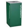 Kaleidoscope Collection XL™ Square 36–gal recycling receptacle. Includes rigid plastic liner with lift handles, sturdy feet to protect floor surfaces and keep unit slightly elevated to allow for air circulation and prevent mold/mildew growth and "mop around" rings. Fingerprint–proof textured Black EXL–COAT™ powder coat finish on body with SIlver Star lid with full trash opening. Crisp, white, easy to read TRASH graphic applied on two sides.