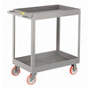 These trucks combine the convenience of 3" deep trays for accumulating and transporting smaller parts with the rugged durability of an all-welded unit. The 3 shelves are formed from 12 gauge steel, with 3" high sides. 2 swivel and 2 rigid non-marking 5" polyurethane casters for easy maneuverability and quiet operation. Clearance between shelves is 10". 35" OAH