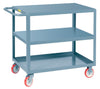 Little Giant durability in an economical shelf truck for medium duty applications. These all welded units ship fully assembled. Features include heavy 12 gauge shelves and non–marking 5" polyurethane casters with ball bearing wheels. Bottom shelf has retaining lip for small parts. Comes with a convenient 21" wide x 12" writing shelf for paperwork adds to the versatility of this truck. This flush model has an 11–3/4" shelf clearance. Dimensions: 18" x 32" x 35".