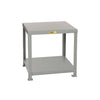 Top is formed from 3/16" thick steel for the heaviest applications, and reinforced with 2" x 2" x 3/16" angle iron. Legs are 2" x 2" x 1/4" angle and have 2-1/2" footpads with 5/8" diameter lag holes. All-welded construction. Available with open base or full flush steel lower shelf.