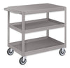 Designed for rugged factory use, yet attractive for use in an office or a store. Features tray top shelf, with 16 gauge shelves. All trays are 2–1/2" deep. Dimensions: 18"W x 28"L x 36"H, 1,000–lbs capacity. Comes with 5" poly casters and three shelves. Options: Drawers, floor lock, wheel brake, flat bottom shelf, writing shelf.