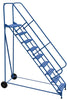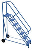 Roll-A-Fold Ladder, the portable ladder that conveniently folds for storage. Constructed of square tubing framework. Features removable hand railing, deep top platform, perforated steps, and an industrial blue powder coat finish. Unit rolls around on large wheels. MFG Part# LAD-RAF-8-24-P-EZ
