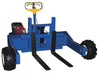 Capacity: 4,000 lbs. (Capacity at an 18" Load Center), Adjustable Fork Width: 8" to 36", Fork: 4"W x 36"L, Service Range: 2–5/8" to 12", Overall Size: 79"W x 68"L – Gas–Powered All–Terrain Pallet Truck – All terrain pallet truck with gas–powered traction drive system. Great for moving heavy loads over rough terrain. Powered by a Briggs & Stratton 6HP gas–powered engine for both the power traction drive and fork lift/lower. Handle with forward reverse speed control and dead man safety switch. Hydrostatic transmission with hand–operated forward and reverse selection. Powered fork raise and lower controlled with independent levers. Usable width between outriggers is 50". Pneumatic steer wheels are 13" diameter x 4" wide each. The drive wheels are 18" diameter x 8" wide each. Wheels include sealed bearings for outdoor use. Steering arc is 150°.