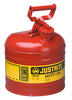 Compliant and economical Justrite Type I safety cans reduce fire risks and make everyday use of flammables easier and safer. Protection features include a 3.5" long chemical resistant stainless steel flame arrester that stops flashback ignition, provides faster liquid flow, and offers exceptional durability. The self–venting, self–closing leakproof lid prevents ruptures from pressure build–up and controls vapors and spills. Warning label includes an extra large ID zone for user labeling of contents to avoid misuse, reduce the potential for incompatible mixtures, or may be used to designate department or individual owner. Made of galvanized steel with a tough powder paint finish, can capacities 1 gallon and above have ample headspace to accommodate oil additives. Available in your choice of Red, Yellow, Blue, or Green. Please specify color when ordering.
