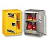 Under Fume Hood Cabinets are fully compliant and designed for the safe storage and venting of solvents and flammable liquids. These cabinets are available in four widths ranging from 24" to 48". Single–door cabinets are offered in either left or right–hinge door closures. Back wall vents with built–in flame arresters are positioned at lower left and top right for jurisdictions that mandate venting of vapors. Finished in a durable, chemical–resistant powder paint, these cabinets come in two color choices to complement new or existing casework: stainless silver or popular safety yellow. Kickplate measures 4"H x 3"D. Fully welded, double–wall 18–gauge steel with 1–1/2" insulating air space, U–Loc handle comes with double key set or accepts optional padlock stainless steel, 3–pt. bullet self–latching system, Leak proof 2" bottom sump to capture spills. One SpillSlope shelf adjustable on 3" centers. Highly reflective Haz–Alert hazard labeling at top and bottom.