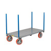 For transporting panels, roll goods and other long items. Three removable uprights extend 27" above the deck. Load space between uprights is 9–1/2". Swivel casters have 5" non–marking polyurethane wheels. Comes with wood rails to protect the load. Capacity: 1,000–lbs. Dimensions: 24" x 36".
