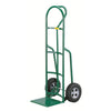 12"D x 14"W Noseplate, 10 year guaranteed noseplate, 4 curved ribs with vertical center strap, heavy 1.05" 14 gauge tubular steel for added strength to frame and stair glides, and an extra–high 29" stair glides provide rigidity and longer frame life. Special 3–hole axle bracket allows for placement of axle to accommodate different size wheels. D–shaped axle eliminates turning and wear of axle. Comes with a 49"H dual handle and 10" x 2.75" Solid Rubber Wheels.