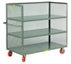 Heavy 12 gauge shelves are enclosed on 3 sides, 48" high above the deck in sturdy 1–1/2" angle iron corners and top trim. 2 swivel, 2 rigid 6" x 2" polyurethane casters with 3,600–lbs capacity. Mesh sides are 13 gauge flattened expanded metal. Comes with 2 shelves with a 22–1/2" clearance. Overall Height: 57". Deck Size: 24" x 48".