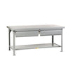 Heavy Duty Welded Workbenches have an extra strong 7 gauge (0.180 inch) reinforced steel top with rounded comfort edges that can support up to10,000 lbs. UDL. Heavy 2" x 2" angle legs are 1/4"–thick with welded 7 gauge gussets. The stationary models have 3" x 3" x 1/4" footpads with a 5/8"–diameter anchor hole. A sturdy 12 gauge lower shelf has a 500 lbs. capacity for added storage. All models are welded and ship set up, ready for immediate use. Workbench comes with a 26"W x 20"D x 6"H (Center Mount) drawer with padlock hasp. Fixed Height Bench is 30" x 36" x 34" and has a 10,000–lbs capacity.