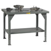 Heavy Duty Welded Workbenches have an extra strong 7 gauge (0.180 inch) reinforced steel top with rounded comfort edges that can support up to10,000 lbs. UDL. Heavy 2" x 2" angle legs are 1/4"–thick with welded 7 gauge gussets. The stationary models have 3" x 3" x 1/4" footpads with a 5/8"–diameter anchor hole. A sturdy 12 gauge lower shelf has a 500 lbs. capacity for added storage. All models are welded and ship set up, ready for immediate use. Adjustable height ranges from 28" to 38" high on 1" centers. Dimensions: 30" x 48". Capacity: 10,000–lbs.