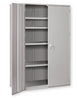 Heavy duty cabinet benches provide solid working surface. Units constructed of 12 gauge top, 14 gauge side leg panels. Unit comes with one shelf with two doors. Comes standard with keyed handle, back and side stops. Benches are 37"H and 3,000–lbs capacity.