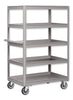 Large volume capacity stock cart are available in tray or flat top configurations. Shelves are 2–1/2"D with 10" clearance. Maneuvers on 2 rigid, 2 swivel, 5" x 1–1/4" polyurethane casters. Dimensions: 18" x 28" x 58.75". Capacity: 1,000–lbs. Optional floor locks and flat shelves available.