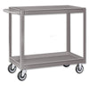 Designed for rugged factory use, yet attractive for use in an office or a store. Features tray top shelf, with 16 gauge shelves. All trays are 2–1/2" deep. Dimensions: 18"W x 28"L x 36"H, 1,000–lbs capacity. Comes with 5" poly casters and three shelves. Options: Drawers, floor lock, wheel brake, flat bottom shelf, writing shelf.