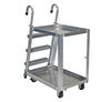 Capacity Per Shelf: 330 lbs., Total Capacity: 1000 lbs., Bottom Shelf Size: 22"W x 36"L, Shelf Clearance: 13", Top Shelf Height: 35" – Aluminum Stockpicker Truck – Combine the mobility of a cart with the versatility of a step ladder with our Stockpicker Trucks. Designed to minimize any risk of injuries that can occur when attempting to stock or unstock shelves from a ladder while pushing a cart. Convenient spring loaded step ladder holds the cart securely in place while a person is standing on the ladder. Crutch tip ladder prevents the cart from moving while stocking. Springs then return the ladder to the raised position once personnel exit the step. All shelves have a 2" lip turned up to prevent items from falling off. Standard casters are 4" x 2" mold–on–rubber, two rigid and two swivel with wheel brakes. Steel units are powder coated blue as are the ladders of the aluminum units.