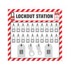 Lockout Stations store and organize locks and tags. Stations contents include: (42) # 7030 1.5" Padlocks, (6) #7046 3" Padlocks (1) # 7619 1" Hasp, (1) # 7620 1.5" Hasp, (2) #7343 10-pack Tags. The station measures 21.5" H x 23"W. An unstocked board is also available, see part # 7355.
