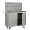 • All-welded 12-gauge construction delivers exceptional strength.• Spacious top work surface measures 24″ x 48″ and stands 41″ high, featuring a three-sided retaining lip for enhanced safety.• Offered with four standard work surface options to meet diverse application requirements.• Outfitted with two swivel and two fixed non-marking polyurethane wheels for effortless maneuverability.• Built-in 16-gauge pegboard tool storage keeps essential tools organized and accessible.• A secure floor lock at the handle end ensures stability during rigorous use.• Finished in a long-lasting, powder-coated gray designed to resist wear and extend the life of the bench cabinet.