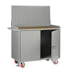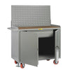 • All-welded 12 gauge construction for superior durability• A generous 24″ x 48″ work surface, elevated to 41″• Three-sided retaining lip on the worktop for enhanced safety (excluding Butcher Block Top models)• Dual polyurethane wheel sets: 2 swivel and 2 fixed non-marking for seamless movement• Secure floor lock at the handle end to stabilize the bench during use• Integrated 16 gauge pegboard tool storage for efficient organization