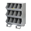 • 14 gauge all-welded steel construction with a long-lasting powder-coated finish• Open hopper front design for fast access and simple loading• Each level measures 12½" H x 15" D x 64" W, adaptable to different space requirements• Option for up to 8 permanent storage compartments per level• Heavy 6" x 2" swivel casters and fixed casters with hard tread phenolic wheels for enhanced mobility• Impressive weight capacity: 800 lbs per tier and 2,400 lbs overall