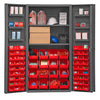 36" wide, 14 gauge, lockable cabinet, with 58 yellow hook-on bins, 1 fixed shelf, 1 adjustable shelf, 4 drawers, 12 door shelves, deep door style, gray Mfg Part#: DCBDLP584RDR-95