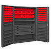 48" wide, 14 gauge, lockable cabinet, with 72 blue hook-on bins, 1 fixed shelf, 1 adjustable shelf, 4 drawers, 12 door shelves, deep door style, gray Mfg Part#: DCBDLP724RDR-5295