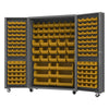 Mobile Heavy Duty Cabinet, 14 Gauge, 36 x 24 x 76, 102 Red Bins, 3 Shelves, 4" Deep Box Doors with Louvered Panel, Lockable, Chrome Handle with Keys, Gray