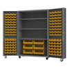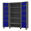 Mobile Heavy Duty Cabinet, 14 Gauge, 36 x 24 x 76, 96 Red Bins, 4 Shelves, 4" Deep Box Doors with Louvered Panel, Lockable, Chrome Handle with Keys, Gray
