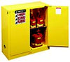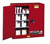 Safe storage for paints and inks. Separate and identify Class III combustibles in high–performance paint and ink safety storage cabinets. Multiple adjustable shelves. OSHA & NFPA compliant, Justrite's FM Approved Safety Cabinets are backed by an industry exclusive Ten–Year Warranty. Double–wall construction with 1.5" insulating air space. Welded 18–gauge steel finished in tough, chemical–resistant baked–on powder paint. Easy close, self–latching doors. Spill–catcher shelves catch incidental drips and adjust on 2.25" centers. Leak tight 2" sump contains spills. Three–point latch with double key set for security. Two 2" vents with integral flame arresters. Trilingual warning label identifies contents. Leveling feet included for balance on uneven surfaces. Unique hidden mechanism maximizes storage space and closes doors automatically on self–close styles. Fusible links hold doors open and melt at 165° F (74° C) to close doors shut under fire conditions.