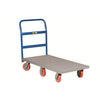 Perfect for moving plywood, drywall, or any sheet products in tight quarters. Six wheel design ensures high maneuverability and “zero turn" capability. Rolls smoothly on 6" non–marking Polyurethane wheels. Includes two heavy duty uprights that extend 27" above the deck and are adjustable in four positions. Capacity: 3,600–lbs. Dimensions: 36" x 72".