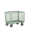 Bulk storage and transport trucks have 24" interior height. Overall height is 32" with 6" x 2" Mold–On Rubber casters, 2 swivel and 2 rigid. Double–hinged top cover has padlock hasp for security. Capacity: 2,000–lbs. Angle iron frame with 3/4" expanded metal sides for greater visibility and airflow. Deck is 12 gauge solid steel for added durability. Deck Size: 30" x 60".