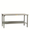 Smooth 12 gauge steel top is double–reinforced with angle iron on the underside and gussets in the corners for exceptional strength and rigidity. Legs and lower braces are 1–1/2" x 1–1/2" x 3/16" thick angle iron. Legs have 2" square footpads with 9/16" hole for mounting to the floor. Angle iron cross braces are centered to allow leg room on both sides. Legs are adjustable from 27" to 41" high on 2" centers. 12 gauge steel top is double–reinforced with angle iron on the underside and gussets in the corners for exceptional strength and rigidity. These all–welded units ship fully assembled and ready for immediate use. Capacity: 5,000–lbs. Dimensions: 36" x 84".