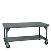 Move these Heavy Duty Workbenches easily with two swivel and two rigid 6" x 2" phenolic casters. When in the desired position, engage the floor lock between the swivel casters to avoid unwanted movement. 7 gauge reinforced steel top with rounded comfort edges. Heavy 2" x 2" angle legs are 1/4" thick with 7 gauge welded gussets. Workbench comes with a 26"W x 20"D x 6"H (Center Mount) drawer with padlock hasp. All models have 34" Bench Top height. Capacity: 3,600–lbs. Dimensions: 30" x 36".