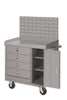 Equipped with four 20"W x 19"D x 5"H drawers on telescoping ball bearing slides. Each unit comes with separate cylinder locks in each drawer & keyed handle in door. Side & backstops prevent objects from falling off work area. Cabinet measures 12"W x 26"H inside. Comes with a 12" x 25" Louvered Board inside the cabinet. Casters: 2 rigid, 2 swivel 5" x 2" Semi–Steel. Capacity: 1,000–lbs. Dimensions: 21.25"D x 36"W x 36"H.