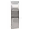Diplomat Series Sensored Roll Towel Dispenser/Waste Receptacle Combination Unit. 22 gauge stainless steel cabinet with exposed surfaces in architectural satin finish, designed with unique dual–curve geometry. Welded construction with seamless corners and burr–free edges. 20 gauge stainless steel door. Concealed, full–length stainless steel piano hinge. Door has one tumbler locks. Semi–Recess Mounted. Dispenses up to 8 inch Wide x 8 inch diameter Roll Paper Towel. Compliant to ADA standards, consult codes for installation requirements. 21 Gallon Waste Receptacle.