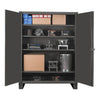 48" wide, 12 gauge, lockable mobile cabinet, with 18 red hook-on bins, 2 adjustable shelves, recessed door style, gray Mfg Part#: HDCM48-18-2S1795