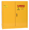 Double wall panel construction of 18–gauge steel all around with 1 1/2" air space between panels. 2" raised leakproof sill at bottom. 2" diameter pipe fitting with fire baffle and cap for outdoor venting. Adjustable shelves support 500 lbs. each. Four adjustable feet level cabinet on uneven floors. Door handle has three–point key lock. Continuous piano hinge allows for consistent door opening and closing. Self–closing doors have fusible links that melt at 165°F automatically closing the doors and protecting your work place. Painted in caution yellow high gloss powder finish with red warning label "FLAMMABLE – KEEP FIRE AWAY".