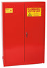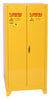 Double wall panel construction of 18–gauge steel all around with 1 1/2" air space between panels. 2" raised leakproof sill at bottom. 2" diameter pipe fitting with fire baffle and cap for outdoor venting. Adjustable shelves support 500 lbs. each. Four adjustable feet level cabinet on uneven floors. Door handle has three–point key lock. Continuous piano hinge allows for consistent door opening and closing. Self–closing doors have fusible links that melt at 165°F automatically closing the doors and protecting your work place. Painted in caution yellow high gloss powder finish with red warning label "FLAMMABLE – KEEP FIRE AWAY".SPECIFICATIONS2 Self-Closing Doors - 364 lbs.1 60-gallon cabinet43" W x 34" D x 44" H