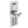 Model 1011HS RIVIVE™ Hydration Station™ vandal-resistant wall-mounted ADA drinking fountain and recessed motion-activated bottle filler features dual 18-gauge Type 304 Stainless Steel satin finish basins with integral swirl design, 14-gauge Type 304 Stainless Steel wall brackets, 100% lead-free waterways, vandal-resistant push-button operated stainless steel valves with front-accessible cartridge and flow adjustment, polished chrome-plated brass vandal-resistant bubbler heads with integral laminar anti-squirt flow, chrome-plated brass vandal-resistant waste strainers, vandal-resistant bottom plates, stainless steel satin finish back panel, high and low fountain mounting levels, and 1-1/4" (3.2 cm) O.D. waste pipes. Bottle filler includes a 3000 gallon (11356 L) capacity, Electronic Lifecycle Control filter cartridge, with filter replacement indicator light, LED lighted 12" sensor operated bottle opening with quick 1.1 gpm fill rate and laminar flow, auto purge feature which automatically cycles water once every 24 hours, display menu which shows sensor range adjustment, factory reset, software/firmware version readout and error readout, along with bottle counter showing number of bottles saved, and vandal-resistant sensor that resists scratching and water droplet fowling. (Filter, P-trap and stop require rear access.)