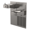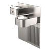 Model H1011.8HO electric Hi-Lo ADA wall mounted combination touchless/push button drinking fountain shall include dual 18 gauge Type 304 Stainless Steel satin finish basins with integral swirl design, 14 gauge Type 304 Stainless Steel wall brackets, 100% lead-free waterways, touchless sensor operated solenoid valve on one side, and push-button operated stainless steel valve with front-accessible cartridge and flow adjustment on the other, polished chrome-plated brass vandal-resistant bubbler heads with integral laminar anti-squirt flow, chrome-plated brass vandal-resistant waste strainers, vandal-resistant bottom plates, stainless steel satin finish back panel and louvered intrusion-proof grill, high and low fountain mounting levels, and 1-1/4" O.D. (3.2 cm) waste pipes. The R-134a refrigeration system is hermetically sealed and delivers a minimum of 8 gph (30.3 L) of water at 50° F (10° C) cooled from 80° F (26.7° C) inlet water at 90° F (32.2° C) ambient. 115 Volts, 60Hz, rated watts: 370, full load amps: 5.