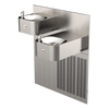 Model H1011.8HO2 electric Hi-Lo ADA wall mounted touchless drinking fountain shall include dual 18 gauge Type 304 Stainless Steel satin finish basins with integral swirl design, 14 gauge Type 304 Stainless Steel wall brackets, touchless sensor operated stainless steel solenoid valves controlled by a transformer, 100% lead-free waterways, polished chrome-plated brass vandal-resistant bubbler heads with integral laminar anti-squirt flow, chrome-plated brass vandal-resistant waste strainers, vandal-resistant bottom plates, stainless steel satin finish back panel and louvered intrusion-proof grill, high and low fountain mounting levels, and 1-1/4" O.D. (3.2 cm) waste pipes. The R-134a refrigeration system is hermetically sealed and delivers a minimum of 8 gph (30.3 L) of water at 50° F (10° C) cooled from 80° F (26.7° C) inlet water at 90° F (32.2° C) ambient. 115 Volts, 60Hz, rated watts: 370, full load amps: 5.