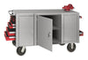 Locking tool box, has 9 drawers: (2) each, 21–1/2"W x 3–1/2"H, (2) each, 21–1/2"W x 1–3'4"H, (4) each 6–1/2"W x 1–3/4"H, and (1) each, central locking drawer 6–1/2"W x 3–1/2"H. Three rear 52"W x 8"D utility shelves add to storage space. 4,000–lbs capacity. Casters: 2 rigid, 2 swivel 5" x 2" polyurethane. Dimensions: 24"D x 52"W x 36.5"H. Optional vise and floor lock available.
