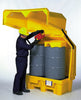 All polyethylene construction, offering excellent chemical resistance, will not rust or corrode. Low profile (8 3/4") containment pallet positions drum–tops at a safe, convenient level to pour wastes into funnels or to use drum pumps. Multiple "4–drum compartments" offer flexible usage for a broad range of operations. Internal walls and separate sumps allow materials to be segregated. Meets EPA Container Storage Regulation 40 CFR 264.175 and helps comply with NPDES,40 CFR 122.26 (1999). Considered a Stormwater Management "Best Management Practice" product (BMP), and meets SPCC Regulations for Secondary Containment of hydrocarbons. Swing–outdoors provide safety and convenience for loading/unloading. Rugged, 9000 lb. uniformly distributed load (UDL) capacity allows safe storage of IBC tanks as well as drums. Separate, lockable compartments feature a unique "2–way" entry system allows access to all four (4) drums. Roll–top covers can be easily lifted from waist height to access drum tops.