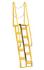 Number of Steps: 10, Top Step Height: 72", Length: 53.21", Step Angle: 56 degrees – Alternating–Tread Stairs – Design offers a shorter span than traditional steps. Features handrail on each side of unit, dual safety chain at top of stair and formed steel steps with raised surfaces for better traction. Rugged welded steel construction. Powder coated safety yellow finish. Ships knockdown for lower freight costs.