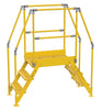 Number of Steps: 3, A: 28", B:38–1/2", C: 78–1/2", D: 72–3/4", E: 30", F: 48" – Cross–Over Ladders – Mount where you need permanent access at crossover points. The upper platform features removable two sided 42" high handrail with 21" mid–rail and fixed 4" toeboards to prevent objects from rolling off. Serrated steps for extra grip and safety are 24" wide and 7" deep with a step height of 10". The overall ladder width is 29". Ground legs include rubber feet for stability. All welded steel construction with removable handrails. Capacity is 500 pounds. Meets OSHA and ANSI A14.7 standards.