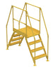 Number of Steps: 4, A: 38", B:50–1/2", C: 103", D: 82–3/4", E: 40", F: 60" – Cross–Over Ladders – Mount where you need permanent access at crossover points. The upper platform features removable two sided 42" high handrail with 21" mid–rail and fixed 4" toeboards to prevent objects from rolling off. Serrated steps for extra grip and safety are 24" wide and 7" deep with a step height of 10". The overall ladder width is 29". Ground legs include rubber feet for stability. All welded steel construction with removable handrails. Capacity is 500 pounds. Meets OSHA and ANSI A14.7 standards.